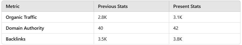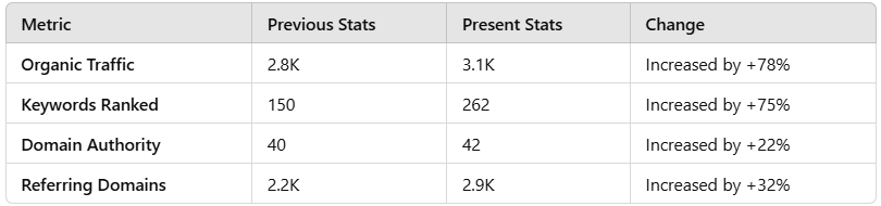 The website has experienced significant growth in key performance metrics: organic traffic increased by 78%, from 2.8K to 3.1K; the number of keywords ranked rose by 75%, from 150 to 262; domain authority improved by 22%, from 40 to 42; and referring domains grew by 32%, from 2.2K to 2.9K. These enhancements indicate a substantial improvement in search engine visibility, SEO optimization, and overall site authority.