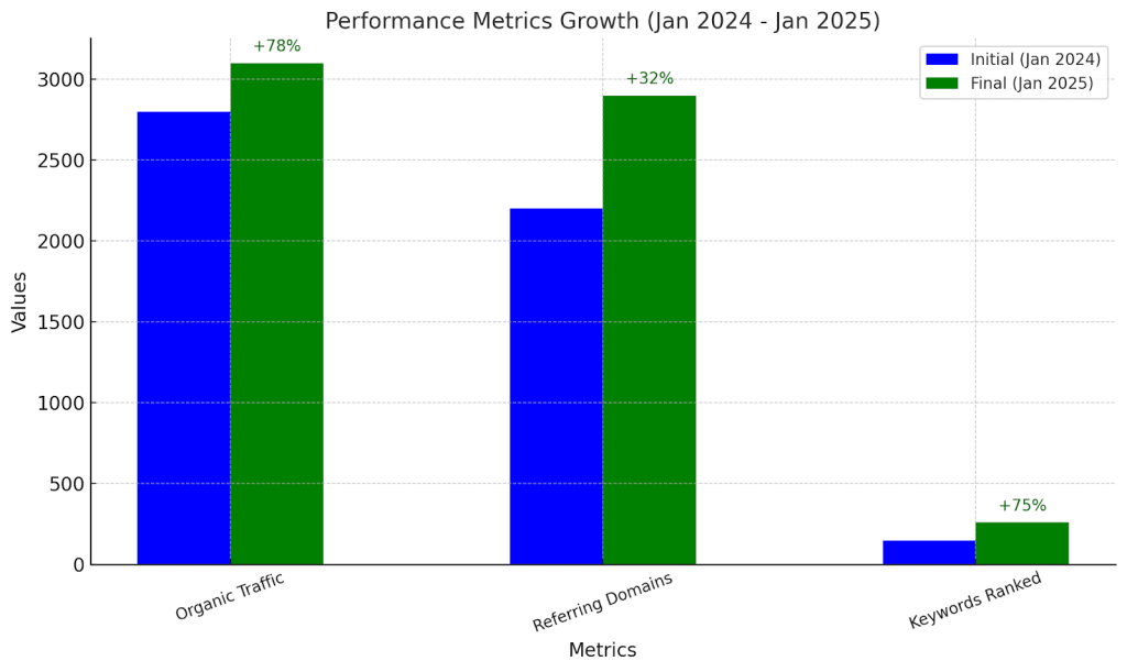 • Organic Traffic: Traffic grew by 78%, from 1,730 visitors in January 2024 to 3075.