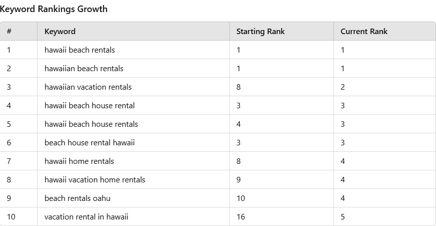 Hawaiian Beach Rentals has achieved notable progress in keyword rankings: