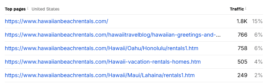 The website’s top-performing pages reveal what users find most engaging. The homepage leads with 1.8K visits, making up 15% of the total traffic. A blog post about Hawaiian greetings is also popular, drawing 766 visits (6%), showing strong interest in cultural insights. Rental pages for Honolulu (758 visits, 6%), the main vacation rentals overview (505 visits, 4%), and Lahaina (249 visits, 2%) highlight the demand for travel planning and accommodations. These pages demonstrate how the site supports users in exploring Hawaiian culture and planning memorable vacations.