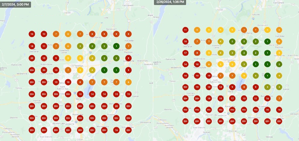 - Before and After Visualization:Â Heat maps from Local Falcon vividly display the dramatic improvements in local keyword ranking.